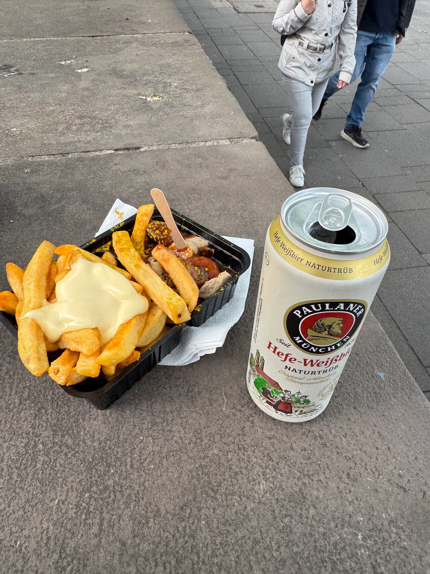 Hvis man er usikker på hva man vil ha til middag, så er alltid currywurst og en weissbier en god backup mens man sitter og ser på kanalbåtene gli forbi.